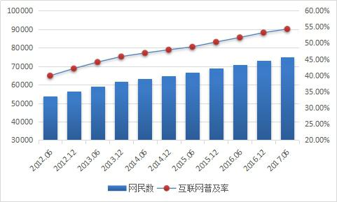 根據(jù)CNNIC最新數(shù)據(jù)顯示,截止2017年6月,我國網(wǎng)民規(guī)模達到7.51億,半年共計新增網(wǎng)民1992萬人?;ヂ?lián)網(wǎng)普及率為54.3%,較2016年底提升1.1個百分點。我國網(wǎng)民規(guī)模增長趨于穩(wěn)定,互聯(lián)網(wǎng)行業(yè)持續(xù)穩(wěn)健發(fā)展,以互聯(lián)網(wǎng)為代表的數(shù)字技術正在加速與經濟社會各領域深度融合,成為促進我國消費升級、經濟社會轉型、構建國家競爭新優(yōu)勢的重要推動力。