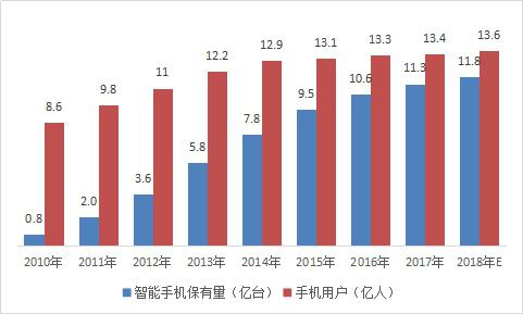 2010-2018年中國智能手機保有量