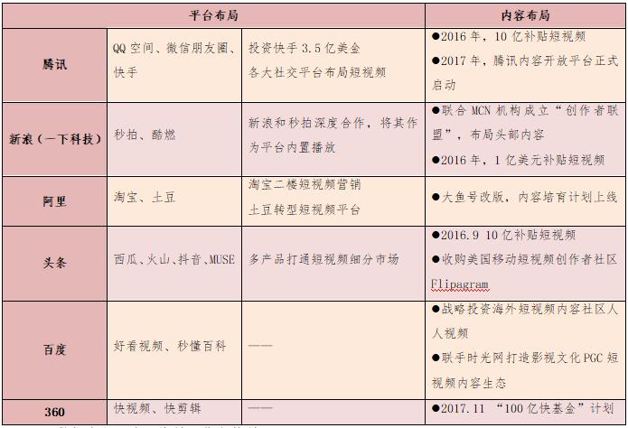 以BAT為首的機構重金加速布局短視頻平臺。今日頭條、騰訊、秒拍等均投入10億元扶持短視頻內容創(chuàng)業(yè)者。阿里投入20億元進軍短視頻領域,將土豆網(wǎng)打造為專門的短視頻平臺。騰訊專門成立短視頻中心,負責短視頻平臺運行;愛奇藝短視頻平臺的愛奇藝頭條正在內測;秒拍成為新浪微博獨家短視頻應用,從工具型短視頻機構轉型為社交分享類短視頻平臺;華人文化基金領投的資訊類短視頻平臺梨視頻也已形成業(yè)內影響力;咪咕視訊作為中國移動在視頻領域的唯一版權運營實體,也布局短視頻,與中央電視臺共建業(yè)內領先的短視頻創(chuàng)作者聚集平臺,打造頭部賬號體系,孵化自有明星短視頻賬號,引入知名工作室直接簽約,盤整已有的強IP資源賬號化運作。