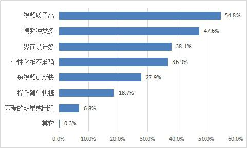 過半受訪者選擇短視頻APP時最看重的是短視頻質量,占比達54.8%,視頻種類和數(shù)量(47.6%),界面設計(38.1%)、個性化推薦(36.9%)、更新速度(27.9%)也是用戶考量的重要因素。分析認為,內容是用戶最關心的要素,對于優(yōu)質內容的爭奪是各短視頻分發(fā)平臺今后競爭的重點。