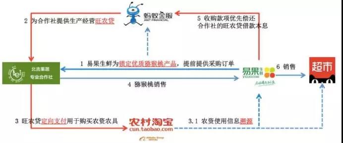 例如:天貓超市的供貨電商易果生鮮與陜西周至縣北吉果蔬專業(yè)合作社簽訂采購(gòu)協(xié)議。螞蟻金服基于采購(gòu)訂單,在對(duì)訂單進(jìn)行識(shí)別并確認(rèn)后,由網(wǎng)商銀行為合作社數(shù)百名果農(nóng)社員提供低息貸款,果農(nóng)拿到這筆貸款后,通過(guò)定向支付工具專項(xiàng)用于從農(nóng)村淘寶購(gòu)買指定的農(nóng)藥、農(nóng)資、農(nóng)具。最后果品通過(guò)易果生鮮進(jìn)駐天貓超市進(jìn)行銷售。這種基于產(chǎn)業(yè)鏈形成的閉環(huán)信貸模式,突破了商業(yè)銀行傳統(tǒng)的評(píng)級(jí)授信要求,也無(wú)須另行提供抵押、質(zhì)押、擔(dān)保,提供的資金效率高、環(huán)節(jié)更簡(jiǎn)單,利率則遠(yuǎn)低于民間借貸。